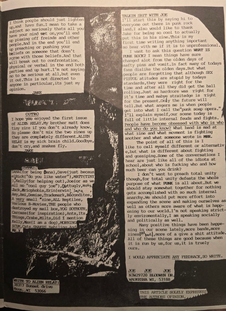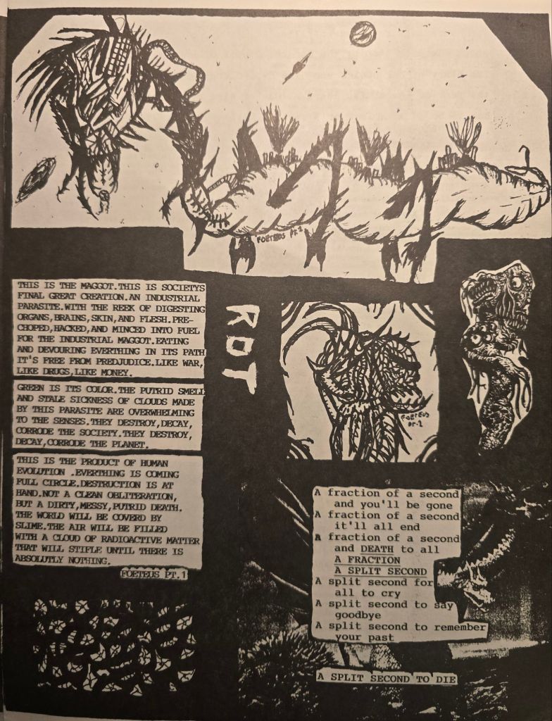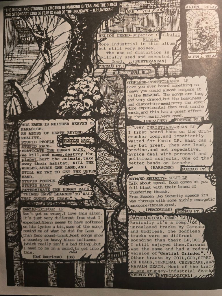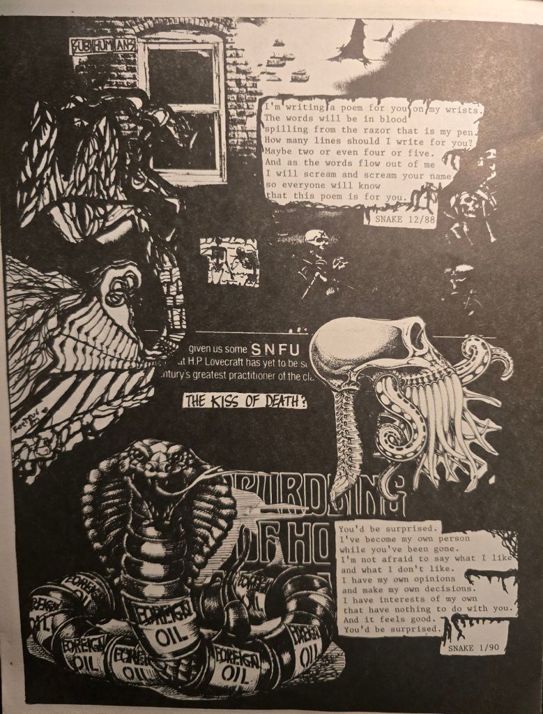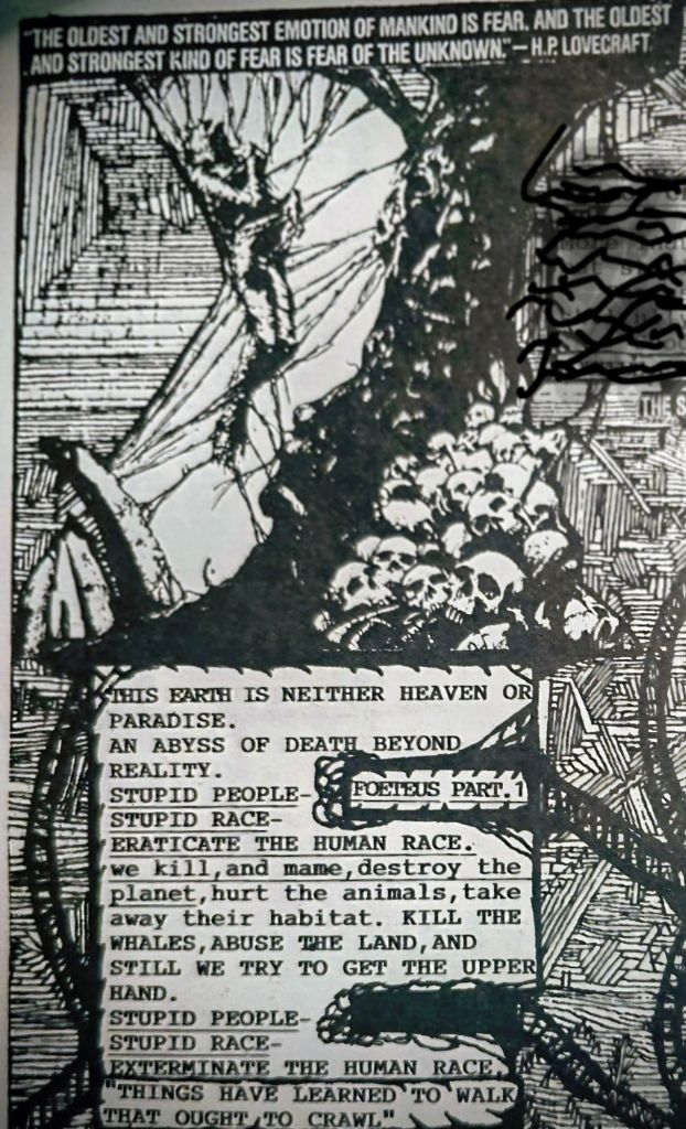 Published ~ 1989/90. I go by the handle of “Foeteus Pt.1” at the time. Why?, thought it sounded cool. I did the layout using lots of collage type, and completely had no idea what I was doing. I was heavy into to punk scene, metal, and Gothic music and culture and political activitism. The printer asked me if I needed to use so much black; i said yes, had too ;)!.