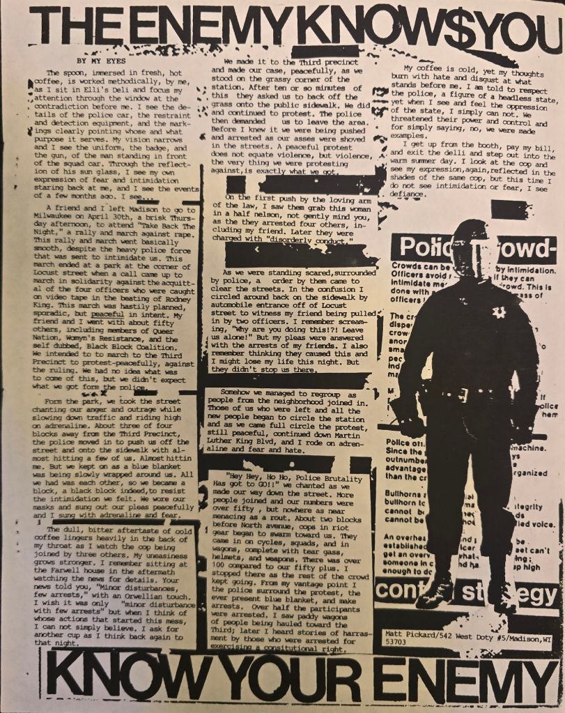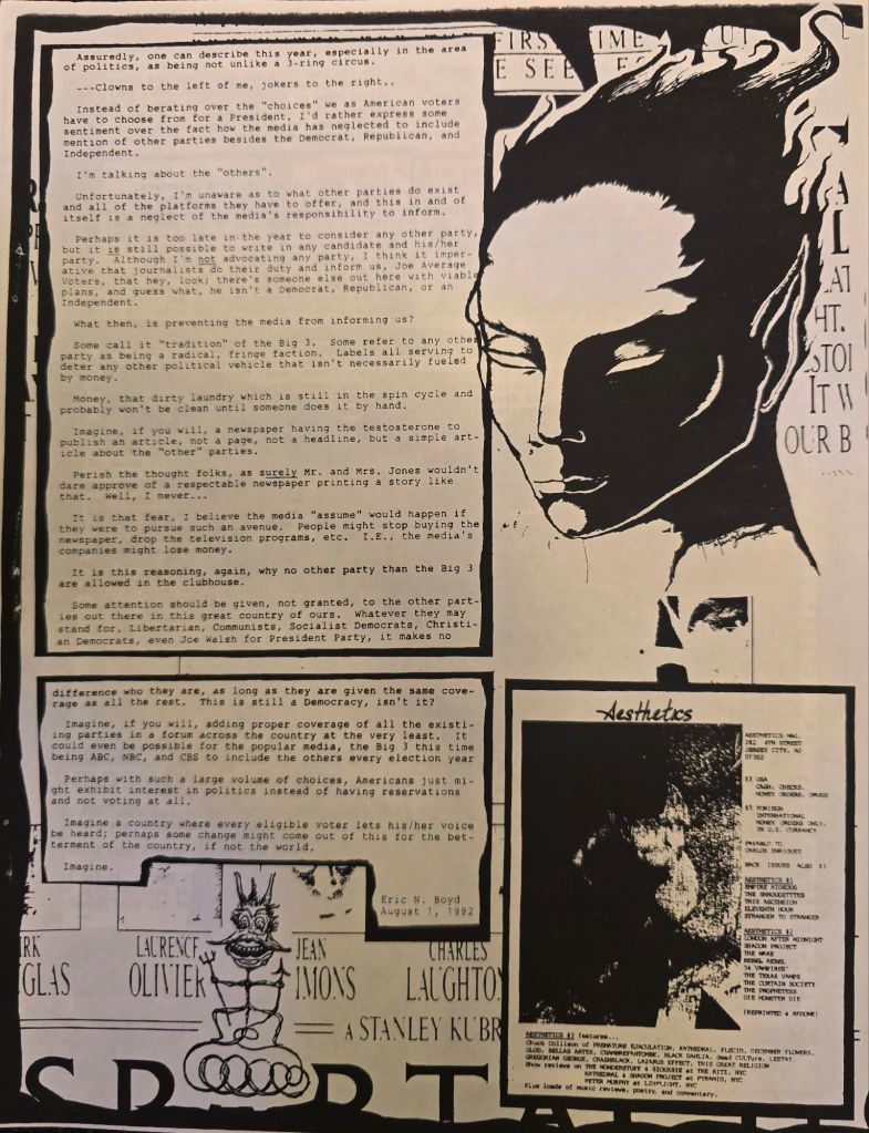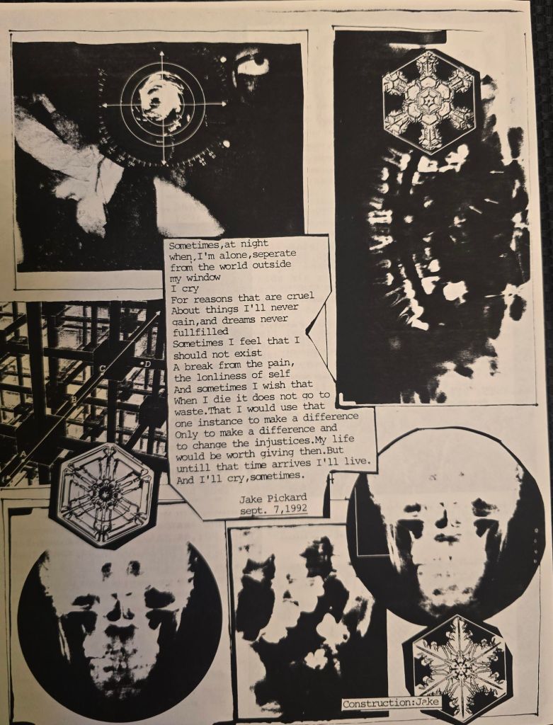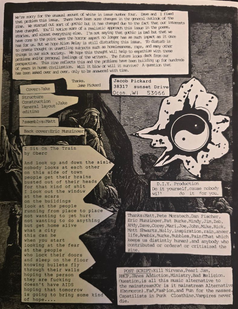 Published October of 1992. I graduated from high school the May of that year. I was still living out in the country between Golden Lake and Dousman, until i moved out in 1993. I got heavily into doing the zine and built my snail mail network even larger in that time. Dave was no longer interested in doing the Zine so I went Solo. I also started playing bass in my first band called Chaste early in 93.