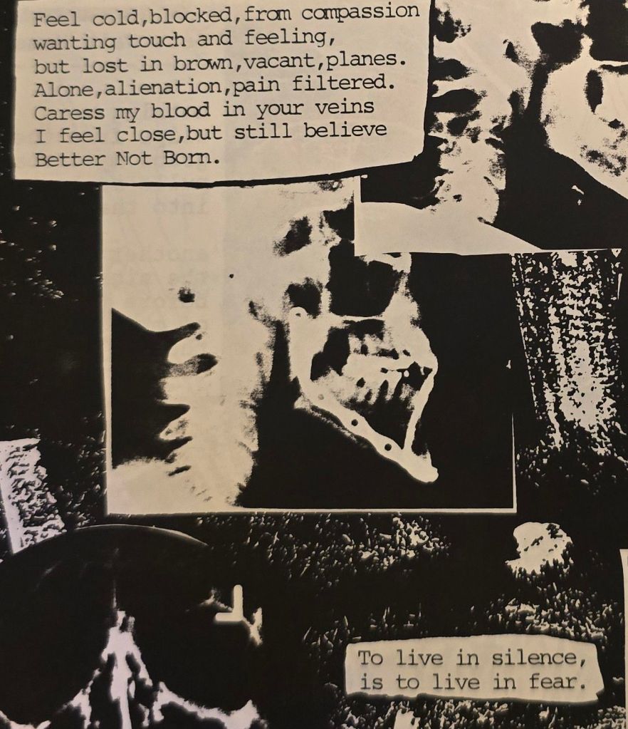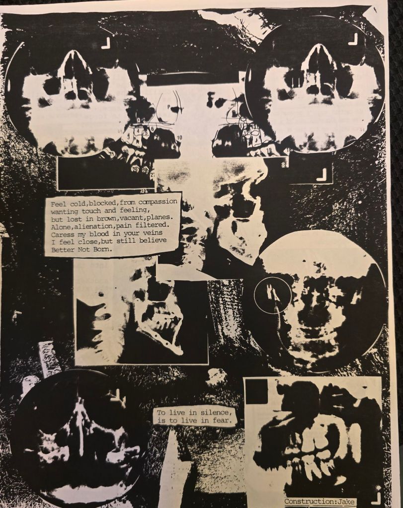 I was still heavy into to the punk scene, death metal, grindcore, and gothic music: culture & political activitism. I took up bass guitar around this time, I used to play Acoustic when i was younger. Hence music reviews. The atmosphere and outlook of the zine still very much dark and trying to still keep it disturbing. Issue 5 had the most white.